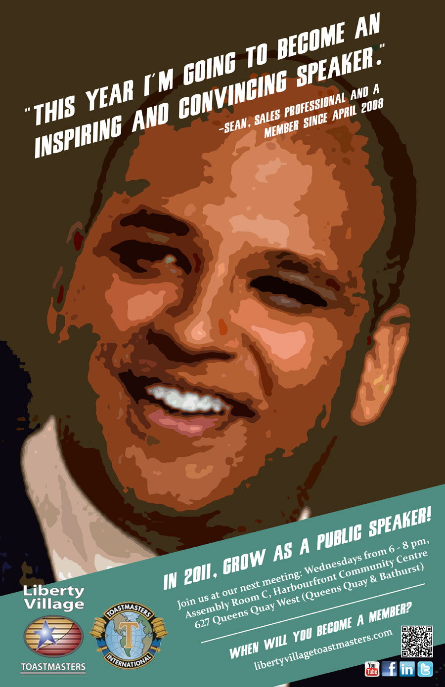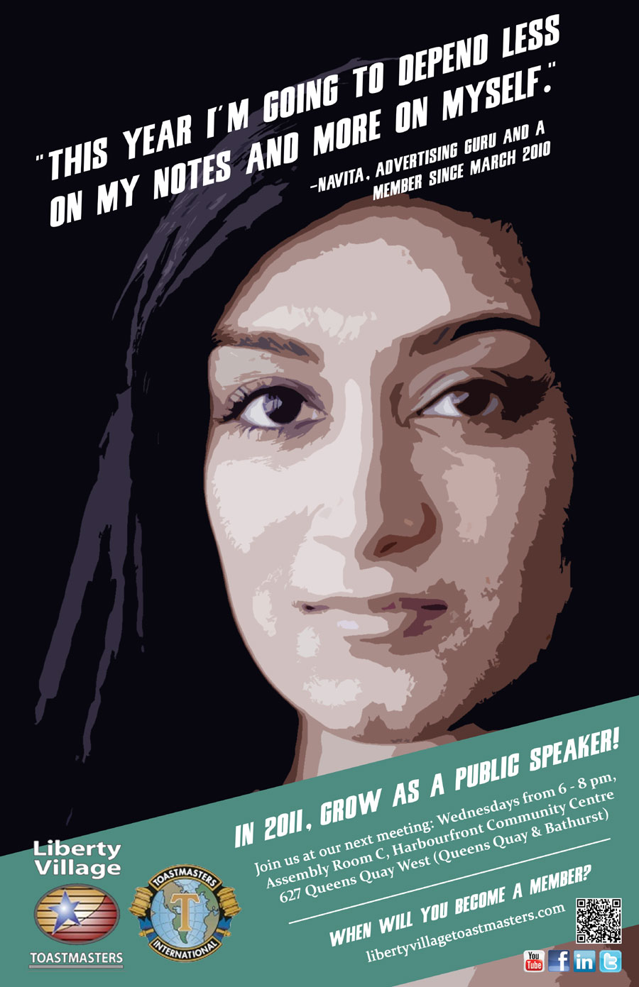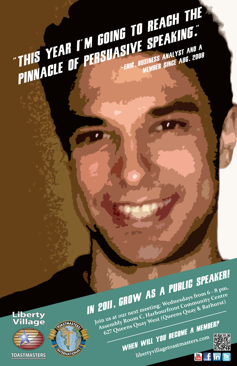 If this sounds like a challenge that you’d be interested in taking on in 2011, then you’ve come to the right place. Liberty Village Toastmasters is one of Toronto’s premier public-speaking groups. With our unique mix of members from industries like marketing, finance, and even show business, there will always be someone interesting to connect with. Here’s how a few of our members plan to grow as public speakers: