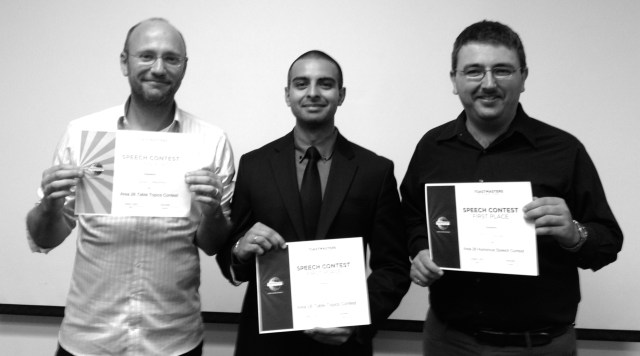 Join LVTM to congratulate Raj (first place Table Topics), Julian (second place on Table Topics) and Chris (1st Place on Humorous Speech) for representing our Club on the Area 26 Speech Contest 2012.
