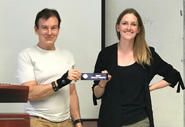 We also had a great Table Topics session hosted by Bob Stewart. Tonight’s topic was on ‘what if all the humans died and you had to pick what kind of animal you reincarnated into. What would you be?’ Our Table Topics winner was Heidi Vandermeer for choosing to be a bacteria that eats plastic!
