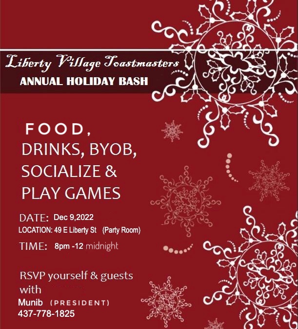 Fellow Toastmasters and honourable guests! Please contact us with your RSVP by Wednesday, December 7th (see below) or email at LibertyVillage.TM@gmail.com !