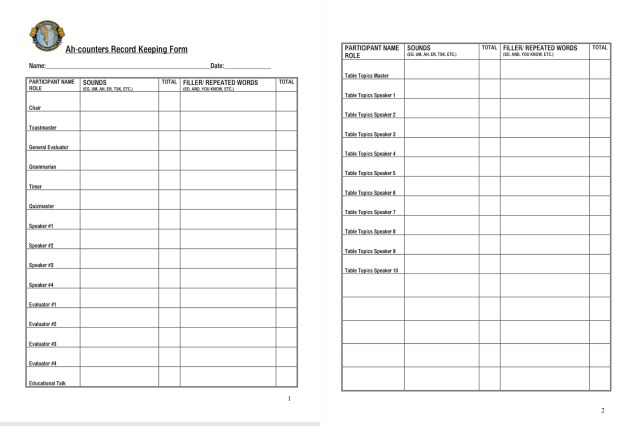 The purpose of the Ah-Counter is to note any overused and repeated words or filler sounds and repeated phrases or obvious corrections used as a crutch by anyone who speaks during the meeting. Words may be inappropriate interjections, such as and, well, but, so and you know. Sounds may be ah, um or er. As Ah-Counter you:
